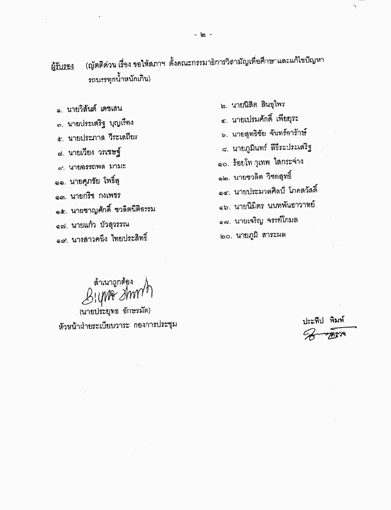 • ขอเสนอญัตติด่วน เรื่อง ขอให้สภาฯ ตั้งคณะกรรมาธิการวิสามัญเพื่อพิจารณาศึกษาและแก้ไขปัญหารถบรรทุกน้ำหนักเกิน