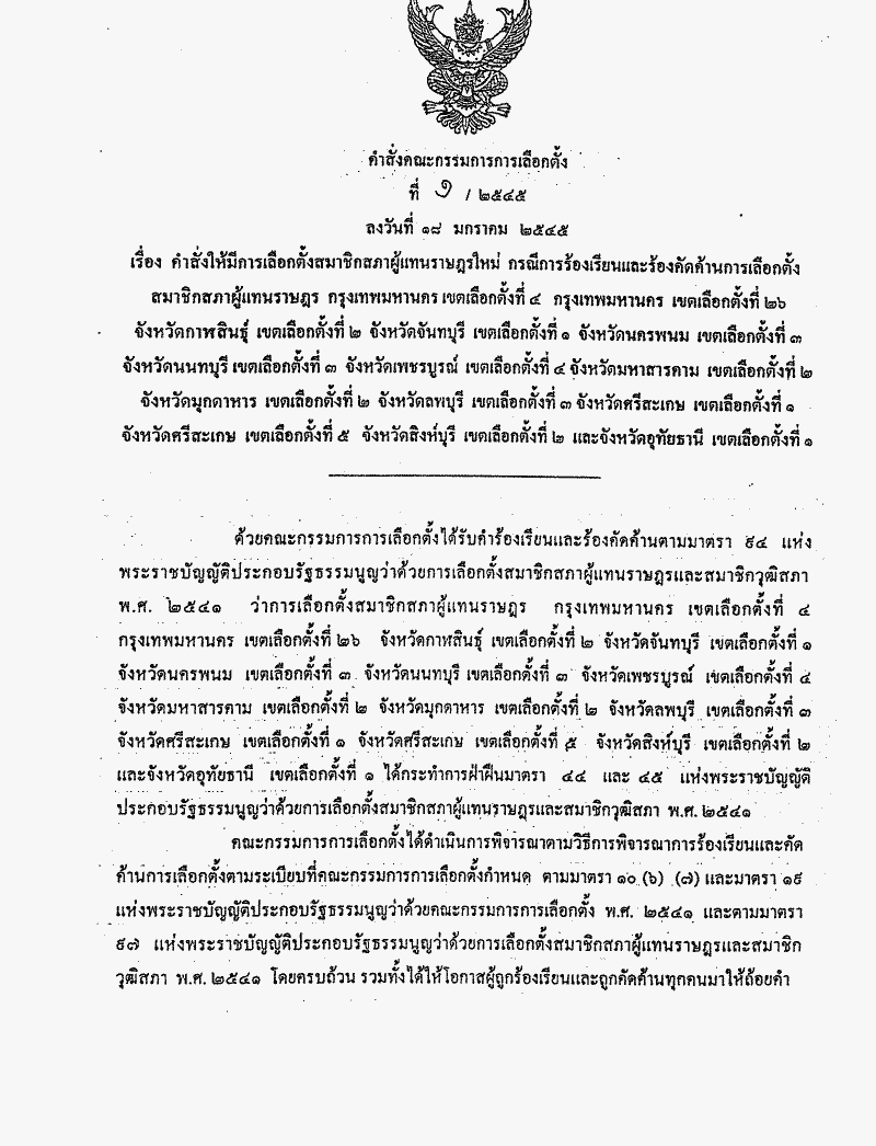 รับทราบเรื่องคำสั่งเพิกถอนสิทธิเลือกตั้งและคำสั่งให้มีการเลือกตั้งสมาชิกสภาผู้แทนราษฎรใหม่ กรณีการคัดค้านการเลือกตั้ง |