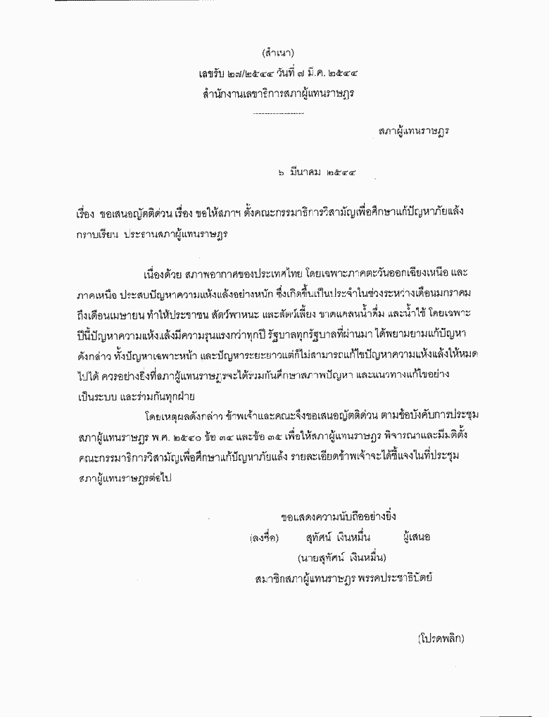 ขอเสนอญัตติด่วน เรื่อง ขอให้สภาฯ ตั้งคณะกรรมาธิการวิสามัญเพื่อพิจารณาศึกษาแก้ปัญหาภัยแล้ง |