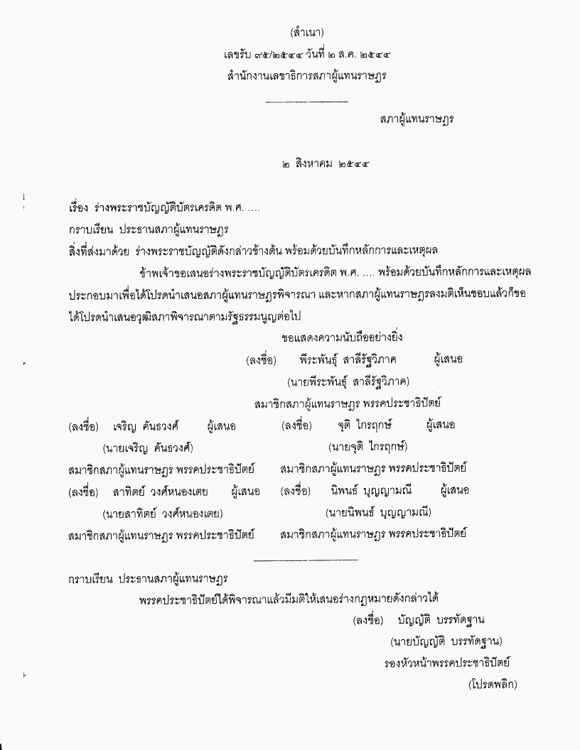 ชื่อเอกสาร :   ร่างพระราชบัญญัติบัตรเครดิต พ.ศ. .... (นายพีระพันธุ์ สาลีรัฐวิภาค กับคณะ เป็นผู้เสนอ)