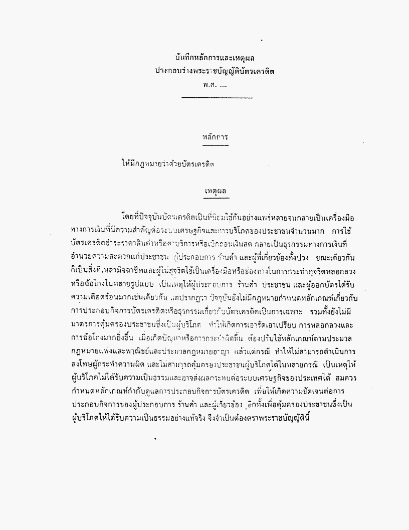 ชื่อเอกสาร :   ร่างพระราชบัญญัติบัตรเครดิต พ.ศ. .... (นายพีระพันธุ์ สาลีรัฐวิภาค กับคณะ เป็นผู้เสนอ)