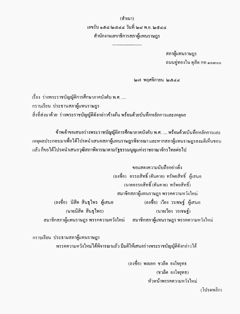 ชื่อเอกสาร : ร่างพระราชบัญญัติการศึกษาภาคบังคับ พ.ศ. .... (นายอรรถสิทธ์ (คันคาย) ทรัพยสิทธิ์ กับคณะ เป็นผู้เสนอ)