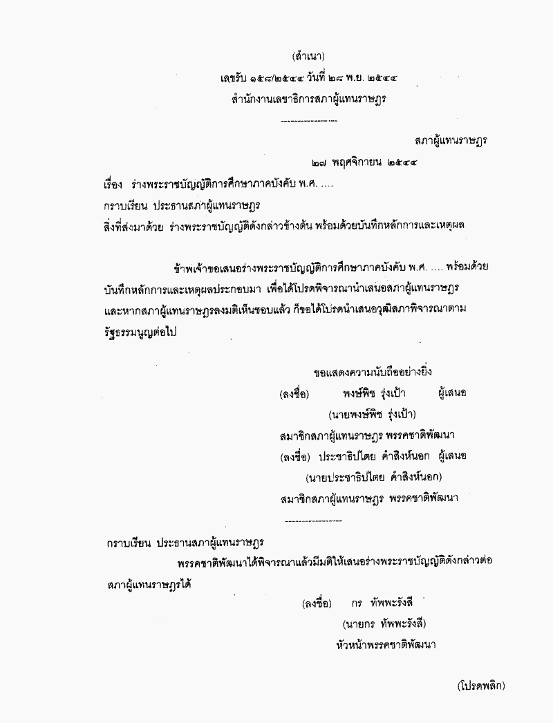 ชื่อเอกสาร :   ร่างพระราชบัญญัติการศึกษาภาคบังคับ พ.ศ. .... (นายพงษ์พิช รุ่งเป้า และนายประชาธิปไตย คำสิงห์นอก เป็นผู้เสนอ)
