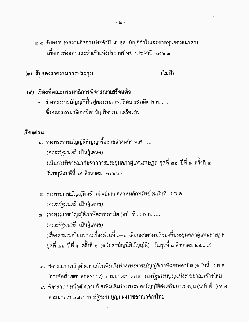 • ระเบียบวาระการประชุมสภาผู้แทนราษฎร ชุดที่ 21 ปีที่ 1 ครั้งที่ 5 (สมัยสามัญนิติบัญญัติ) วันพุธที่ 15 สิงหาคม 2544
