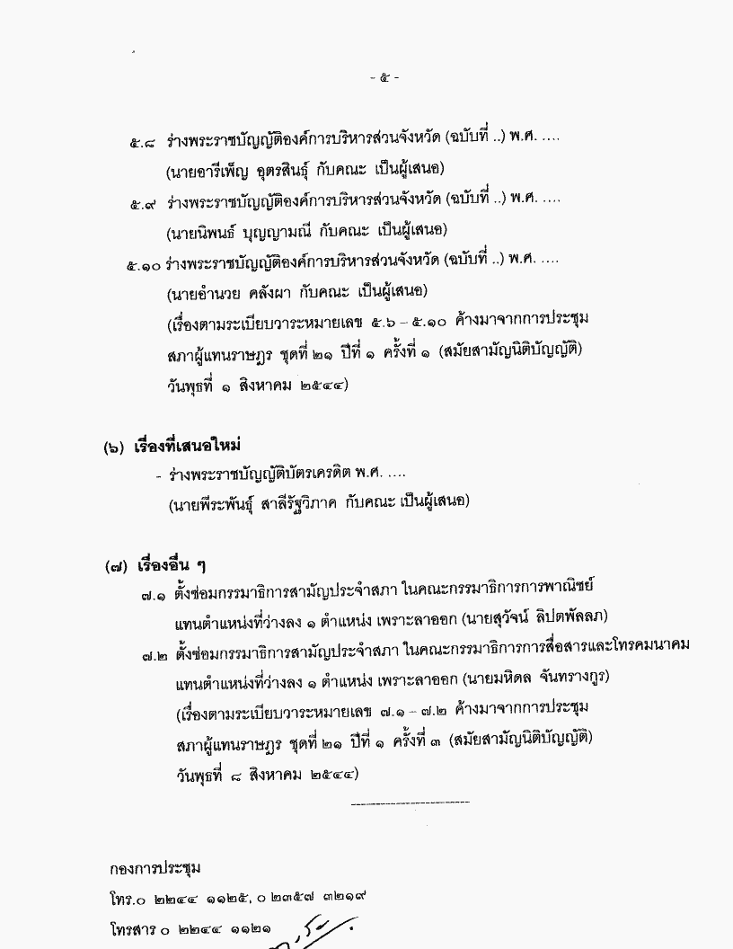 • ระเบียบวาระการประชุมสภาผู้แทนราษฎร ชุดที่ 21 ปีที่ 1 ครั้งที่ 5 (สมัยสามัญนิติบัญญัติ) วันพุธที่ 15 สิงหาคม 2544