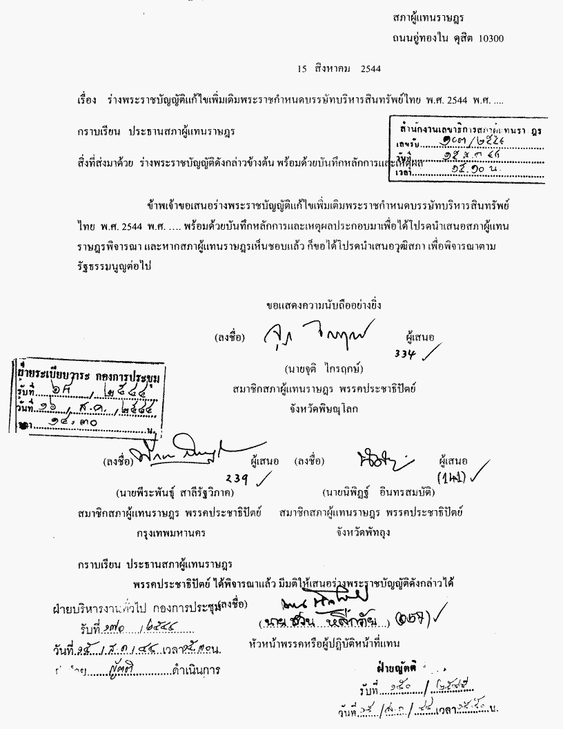 • ร่างพระราชบัญญัติแก้ไขเพิ่มเติมพระราชกำหนดบรรษัทบริหารสินทรัพย์ไทย พ.ศ. 2544 (คณะรฐัมนตรี เป็นผู้เสนอ)