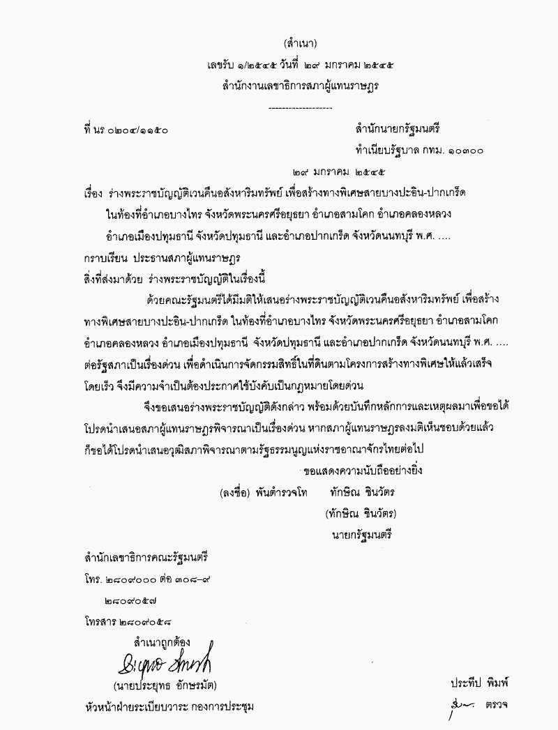 • ร่างพระราชบัญญัติเวนคืนอสังหาริมทรัพย์ เพื่อสร้างทางพิเศษสายบางปะอิน-ปากเกร็ด ในท้องที่อำเภอบางไทร จังหวัดพระนครศรีอยุธยา อำเภอสามโคก อำเภอคลองหลวงอำเภอเมืองปทุมธานี จังหวัดปทุมธานี และอำเภอปากเกร็ด จังหวัดนนทบุรี พ.ศ. ....