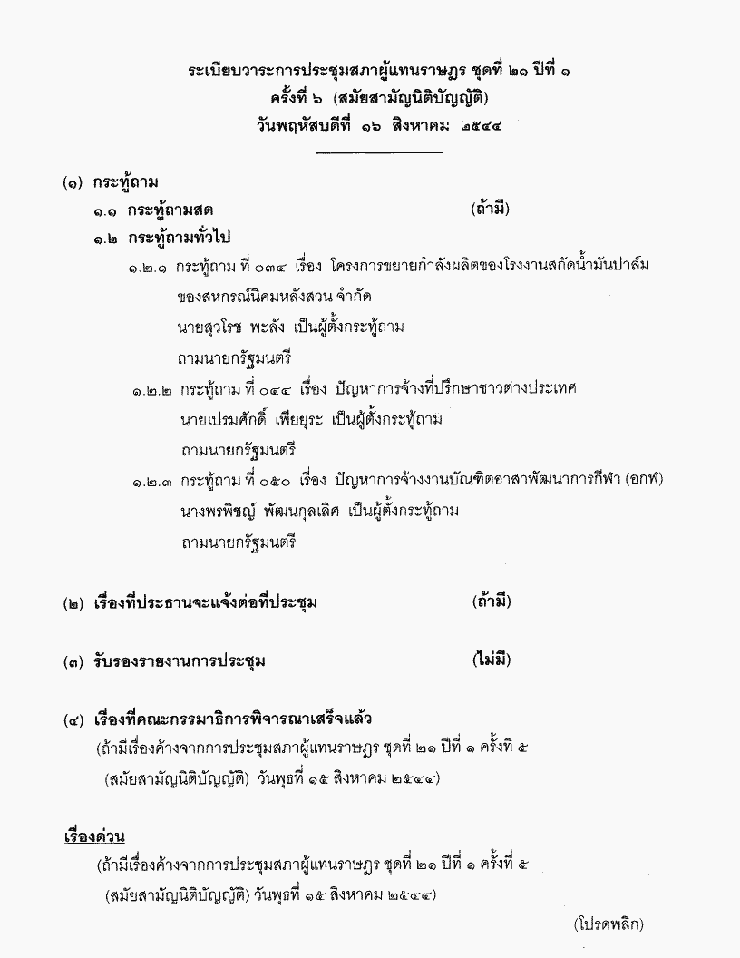 • ระเบียบวาระการประชุมสภาผู้แทนราษฎร ชุดที่ 21 ปีที่ 1 ครั้งที่ 6 (สมัยสามัญนิติบัญญัติ) วันพฤหัสบดีที่ 16 สิงหาคม พ.ศ. 2544