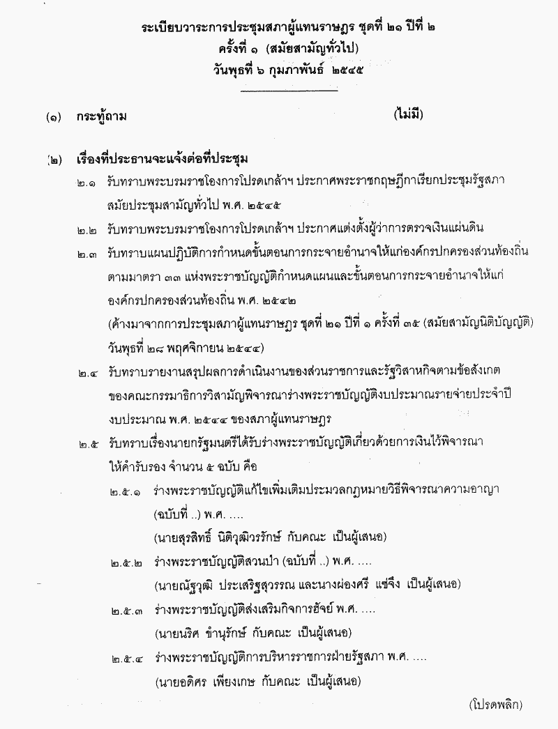• ระเบียบวาระการประชุมสภาผู้แทนราษฎร ชุดที่ 21 ปีที่ 2 ครั้งที่ 1 (สมัยสามัญทั่วไป) วันพุธที 6 กุมภาพันธ์ 2545