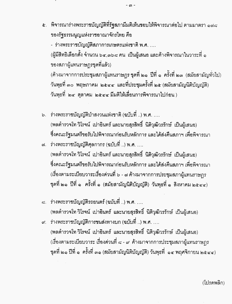 • ระเบียบวาระการประชุมสภาผู้แทนราษฎร ชุดที่ 21 ปีที่ 2 ครั้งที่ 1 (สมัยสามัญทั่วไป) วันพุธที 6 กุมภาพันธ์ 2545