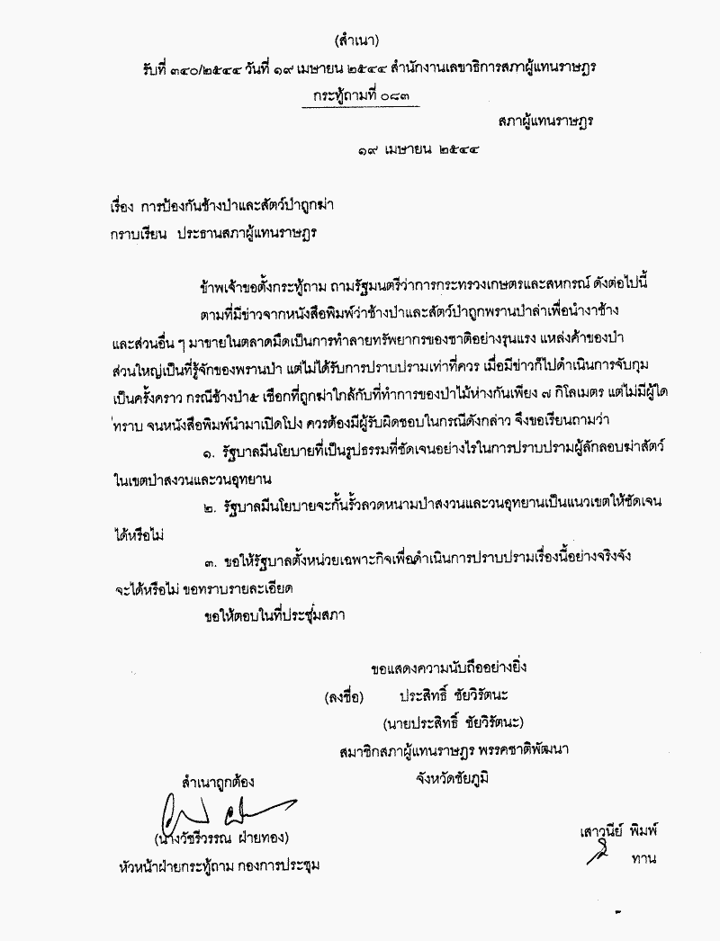 กระทู้ถามที่ 083 เรื่อง การป้องกันช้างป่าและสัตว์ป่าถูกฆ่า นายประสิทธิ์ ชัยวิรัตนะ เป็นผู้ตั้งกระทู้ถาม ถามรัฐมนตรีว่าการกระทรวงเกษตรและสหกรณ์ |