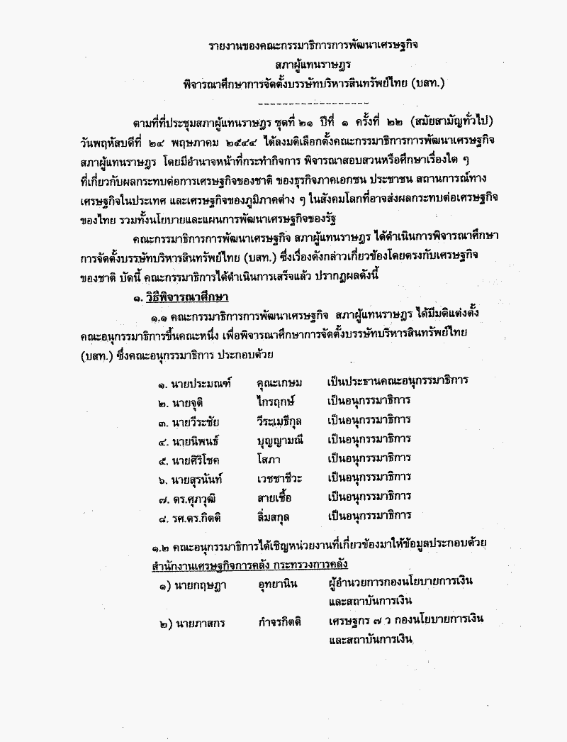 • รายงานผลการพิจารณาศึกษา เรื่อง การจัดตั้งบริษัทบริหารสินทรัพย์ไทย (บสท.) ซึ่งคณะกรรมาธิการการพัฒนาเศรษฐกิจพิจารณาเสร็จแล้ว