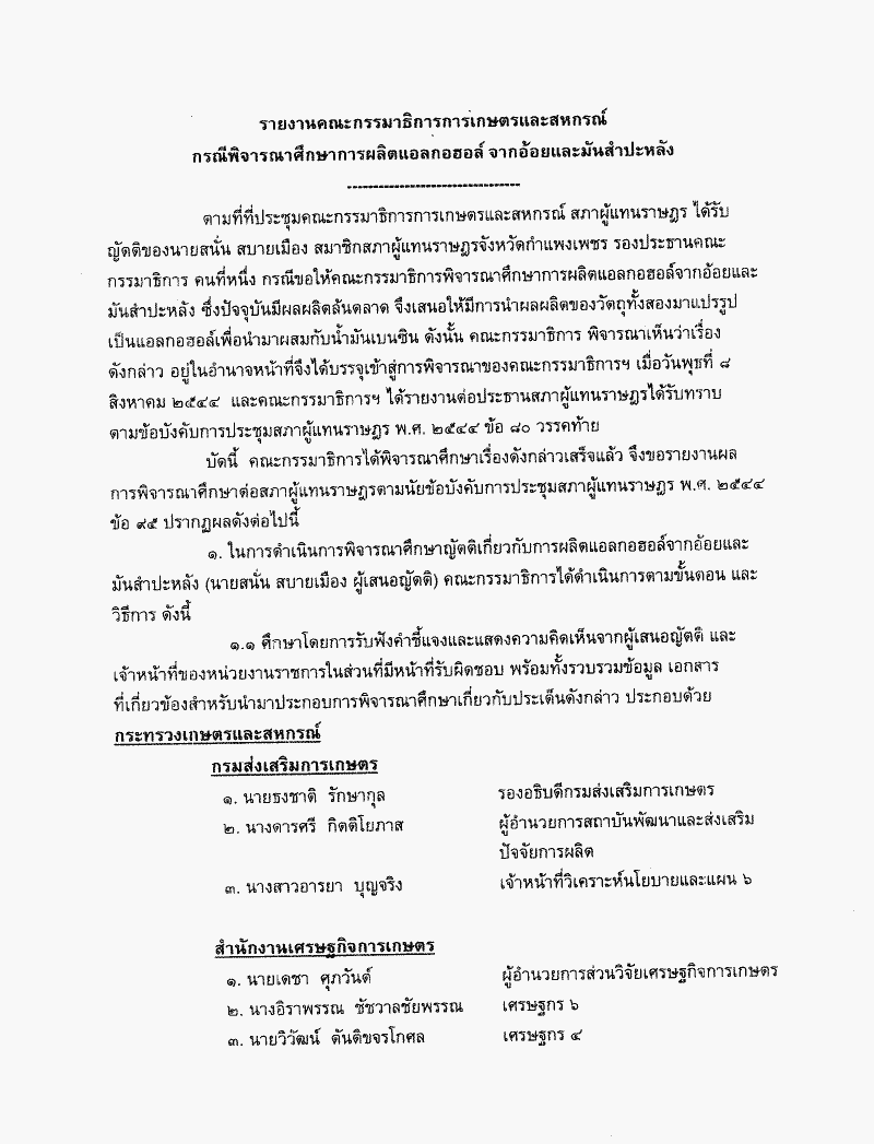 • รายงานผลการพิจารณาศึกษาการผลิตแอลกอฮอล์จากอ้อยและมันสำปะหลัง ซึ่งคณะกรรมาธิการการเกษตรและสหกรณ์พิจารณาเสร็จแล้ว