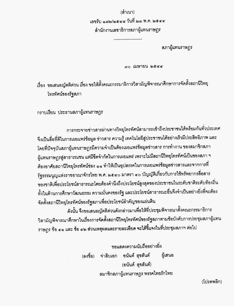 • ขอเสนอญัตติด่วน เรื่อง ขอให้ตั้งคณะกรรมาธิการวิสามัญพิจารณาศึกษาการจัดตั้งสถานีวิทยุโทรทัศน์ของรัฐสภา