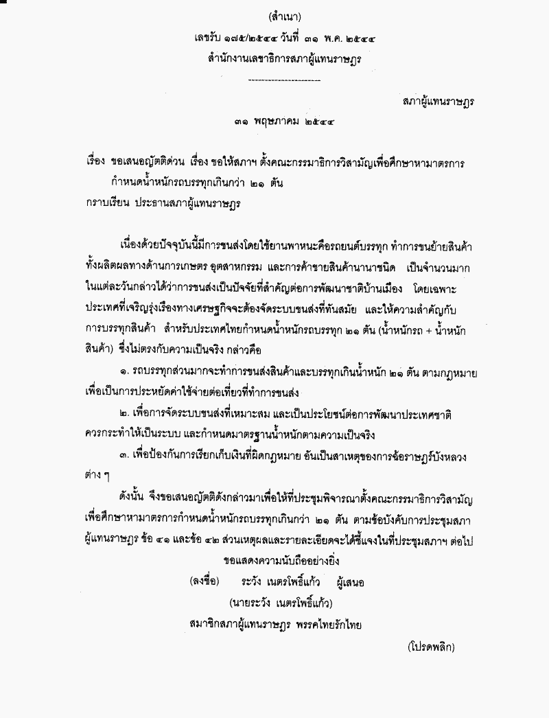 • ขอเสนอญัตติด่วน เรื่อง ขอให้สภาฯ ตั้งคณะกรรมาธิการวิสามัญเพื่อศึกษาหามาตรการกำหนดน้ำหนักรถบรรทุกเกินกว่า 21 ตัน