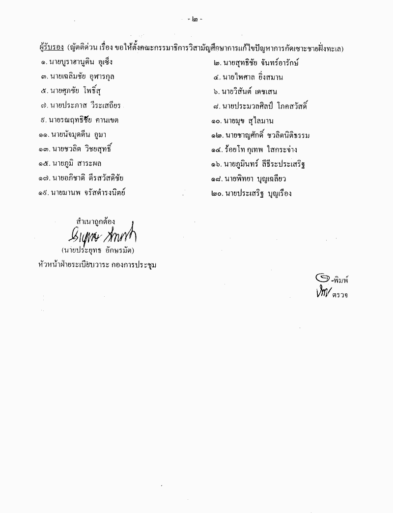 • ขอเสนอญัตติด่วน เรื่อง ขอให้ตั้งคณะกรรมาธิการวิสามัญศึกษาการแก้ไขปัญหาการกัดเซาะชายฝั่งทะเล