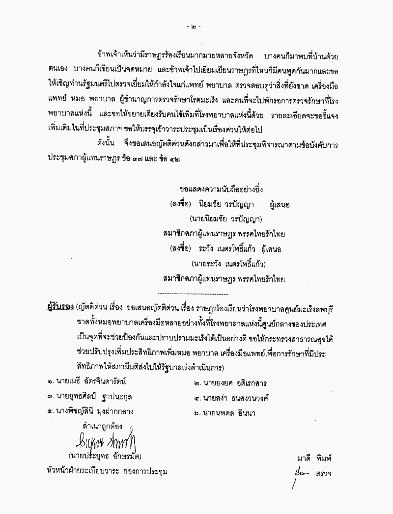 ขอเสนอญัตติด่วน เรื่อง ราษฎรร้องเรียนว่าโรงพยาบาลศูนย์มะเร็งลพบุรี ขาดทั้งหมอพยาบาลเครื่องมือหลายอย่างทั้งที่โรงพยาบาลแห่งนี้อยู่ศูนย์กลางของประเทศเป็นจุดที่จะช่วยป้องกันและปราบปรามมะเร็งได้เป็นอย่างดี ขอให้กระทรวงสาธารณสุขได้ช่วยปรับปรุงเพิ่มประสิทธิภาพเพิ่มหมอ พยาบาล เครื่องมือแพทย์เพื่อการรักษาที่มีประสิทธิภาพให้สภามีมติส่งไปให้รัฐบาลเร่งดำเนินการ |