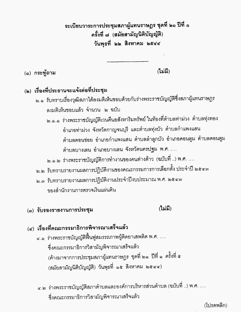 • ระเบียบวาระการประชุมสภาผู้แทนราษฎร ชุดที่ 21 ปีที่ 1 ครั้งที่ 7 (สมัยสามัญนิติบัญญัติ) วันพุธที่ 22 สิงหาคม 2544