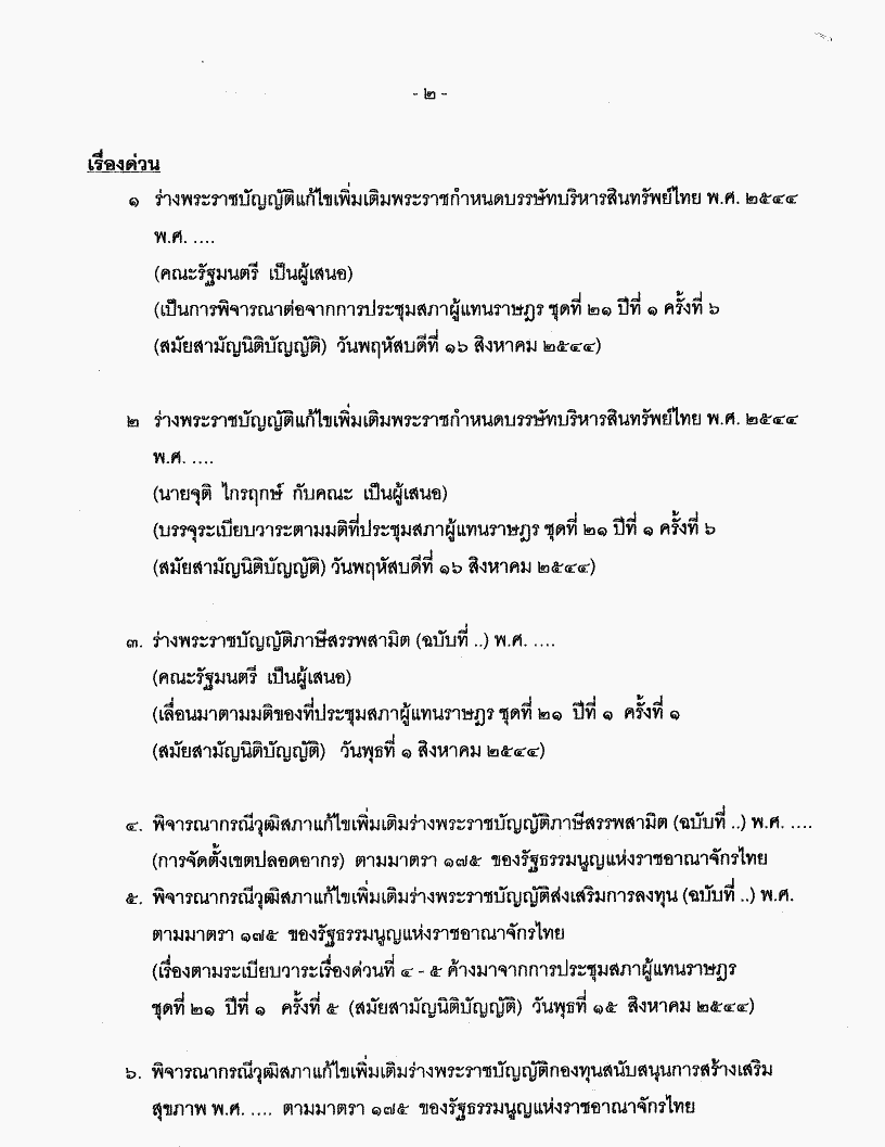 ชื่อเอกสาร : ระเบียบวาระการประชุมสภาผู้แทนราษฎร ชุดที่ 21 ปีที่ 1 ครั้งที่ 7 (สมัยสามัญนิติบัญญัติ) วันพุธที่ 22 สิงหาคม 2544