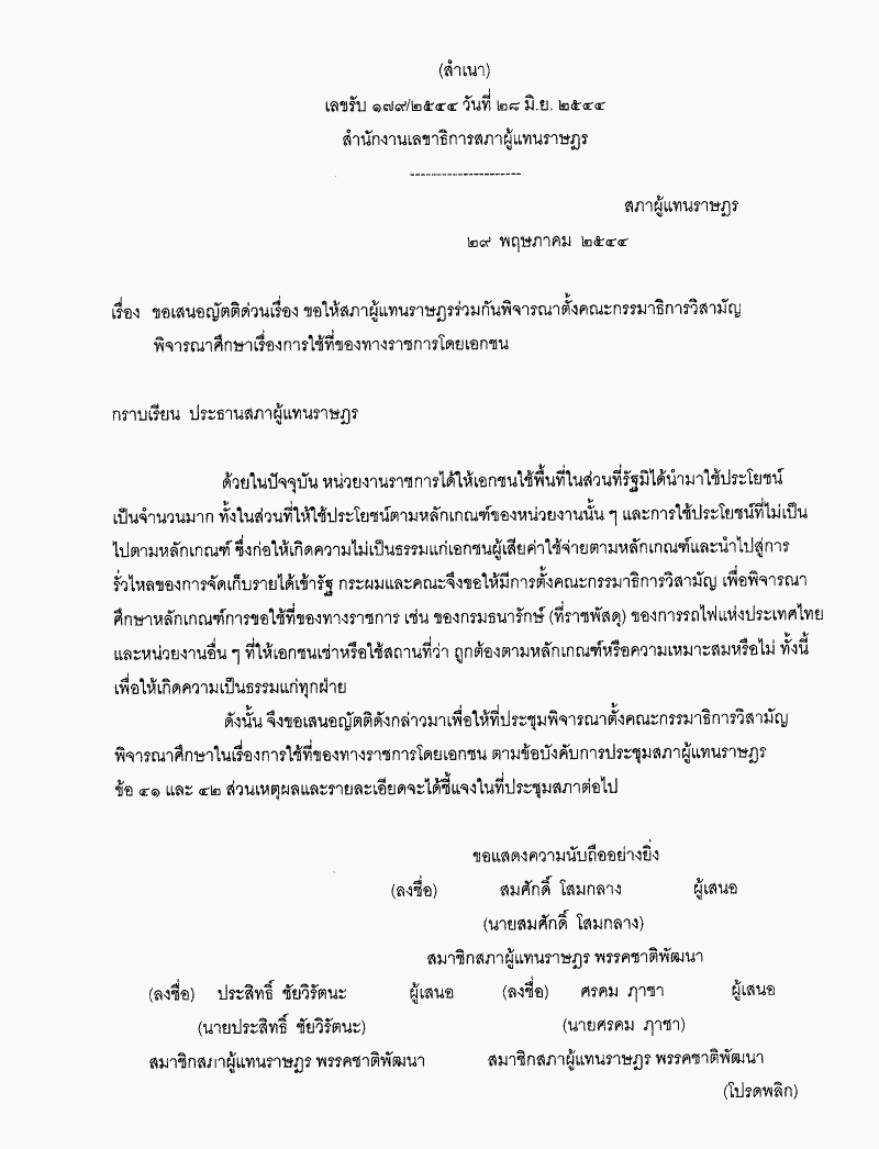 ชื่อเอกสาร :   ญัตติ เรื่อง ขอให้สภาผู้แทนราษฎรร่วมกันพิจารณาตั้งคณะกรรมาธิการวิสามัญขอเสนอญัตติด่วนเรื่อง ขอให้สภาผู้แทนราษฎรร่วมกันพิจารณาตั้งคณะกรรมาธิการวิสามัญพิจารณาศึกษาเรื่องการใช้ที่ของทางราชการโดยเอกชน (นายสมศักดิ์ โสมกลาง กับคณะ เป็นผู้เสนอ)