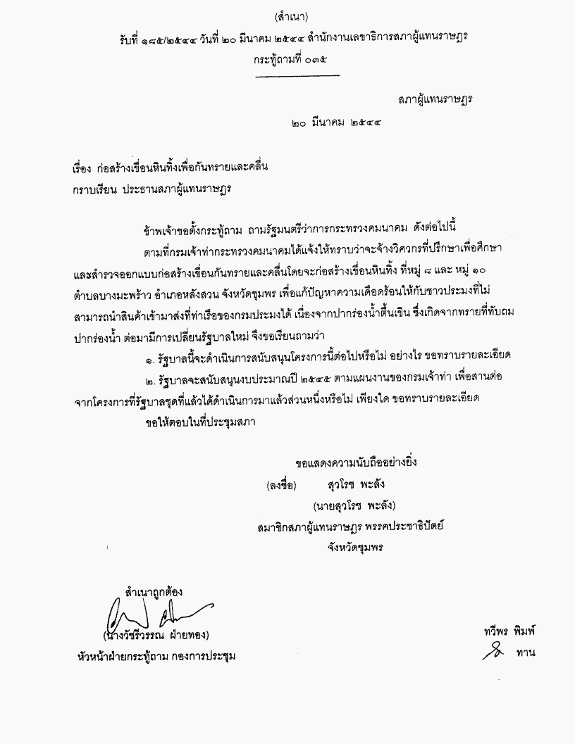 กระทู้ถาม ที่ 035 เรื่อง ก่อสร้างเขื่อนหินทิ้งเพื่อกันทรายและคลื่นนายสุวโรช พะลัง เป็นผู้ตั้งกระทู้ถาม ถามรัฐมนตรีว่าการกระทรวงคมนาคม |
