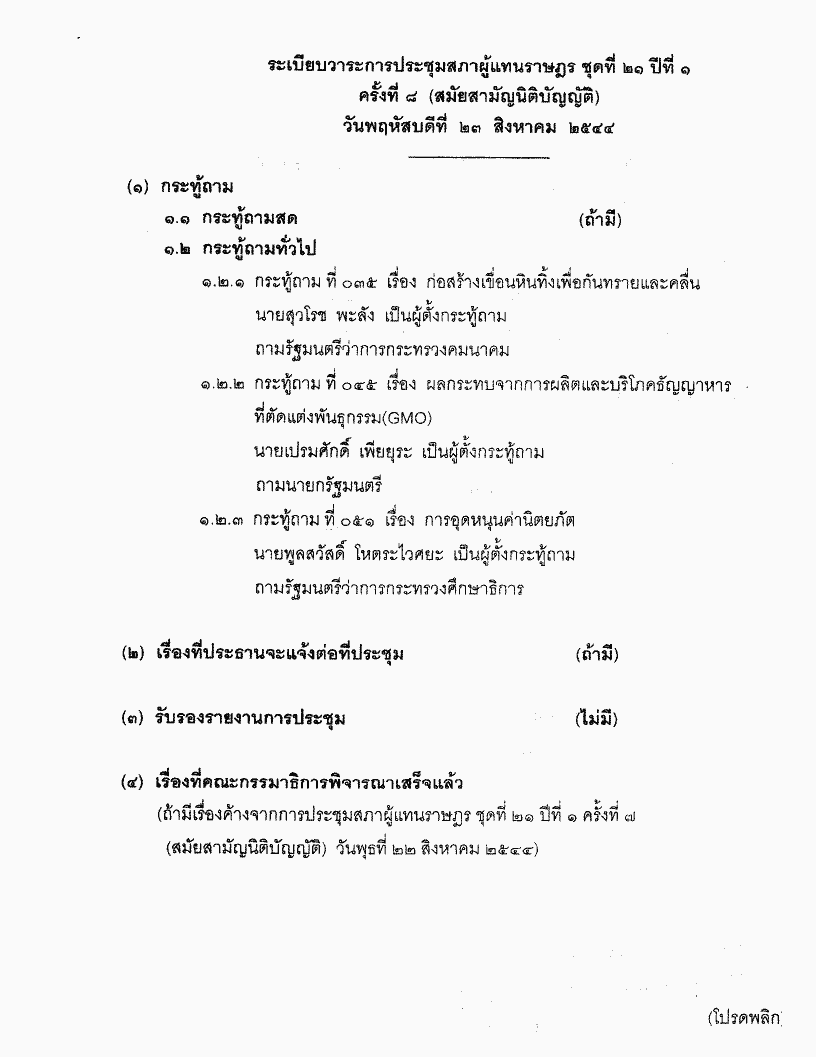 • ระเบียบวาระการประชุมสภาผู้แทนราษฎร ชุดที่ 21 ปีที่ 1 ครั้งที่ 8 (สมัยสามัญนิติบัญญัติ) วันพฤหัสบดีที่ 23 สิงหาคม 2544