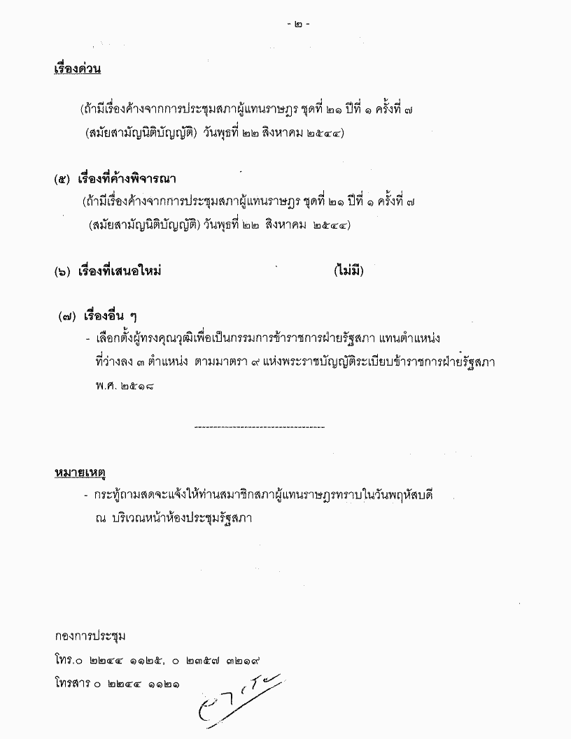 ชื่อเอกสาร : ระเบียบวาระการประชุมสภาผู้แทนราษฎร ชุดที่ 21 ปีที่ 1 ครั้งที่ 8 (สมัยสามัญนิติบัญญัติ) วันพฤหัสบดีที่ 23 สิงหาคม 2544