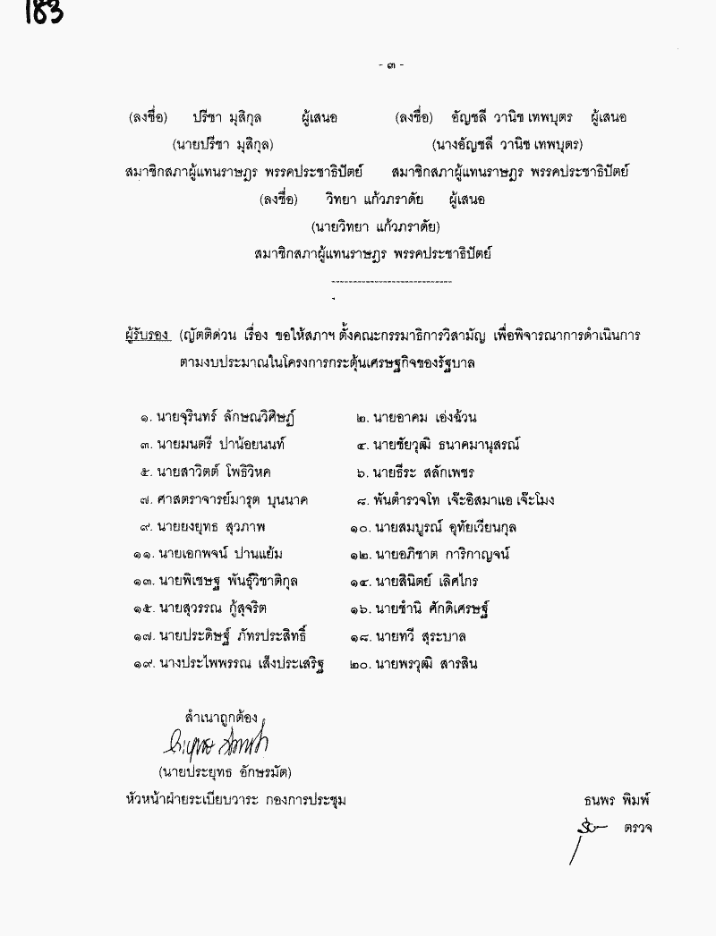 ญัตติ เรื่อง ขอให้สภาฯ ตั้งคณะกรรมาธิการวิสามัญ เพื่อพิจารณาการดำเนินการตามงบประมาณในโครงการกระตุ้นเศรษฐกิจของรัฐบาล งบประมาณในโครงการกระตุ้นเศรษฐกิจของรัฐบาล (นายสาทิตย์ วงศ์หนองเตย กับคณะ เป็นผู้เสนอ) |