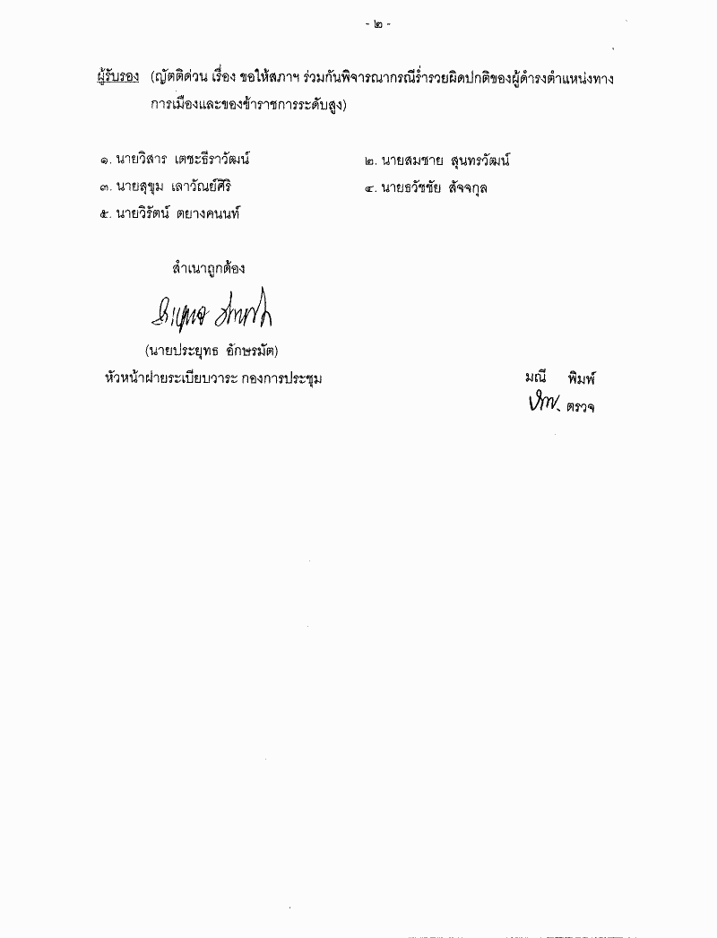 • ขอเสนอญัตติด่วน เรื่อง ขอให้สภาฯ ร่วมกันพิจารณากรณีร่ำรวยผิดปกติของผู้ดำรงตำแหน่งทางการเมืองและของข้าราชการระดับสูง