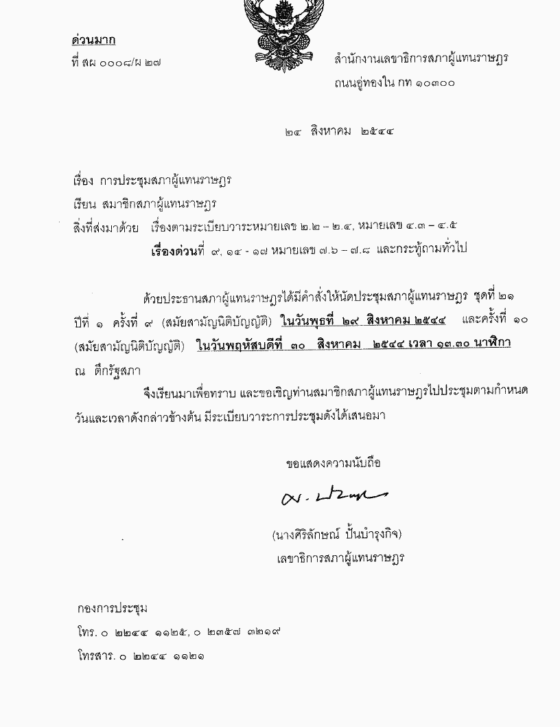• ระเบียบวาระการประชุมสภาผู้แทนราษฎร ชุดที่ 21 ปีที่ 1 ครั้งที่ 9 (สมัยสามัญนิติบัญญัติ) วันพุธที่ 29 สิงหาคม 2544