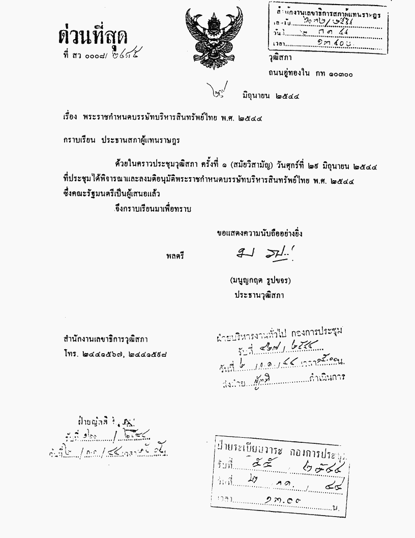 ๒.๕ รับทราบเรื่องวุฒิสภาได้ลงมติอนุมัติพระราชกำหนดบรรษัทบริหารสินทรัพย์ไทย พ.ศ. ๒๕๔๔ |