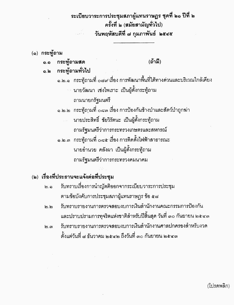 • ระเบียบวาระการประชุมสภาผู้แทนราษฎร ชุดที่ 21 ปีที่ 2 ครั้งที่ 2 (สมัยสามัญทั่วไป) วันพฤหัสบดีที่ 7 กุมภาพันธ์ 2545