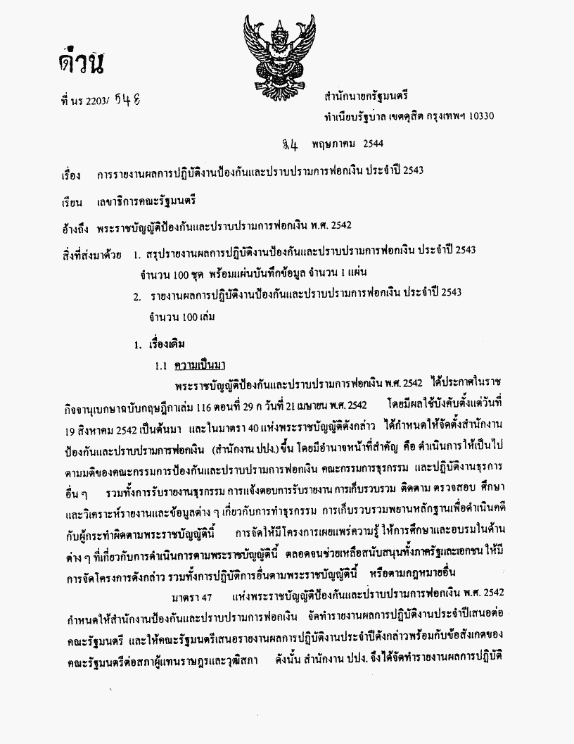 • รายงานผลการปฏิบัติงานป้องกันและปราบปรามการฟอกเงินประจำปี ๒๕๔๓