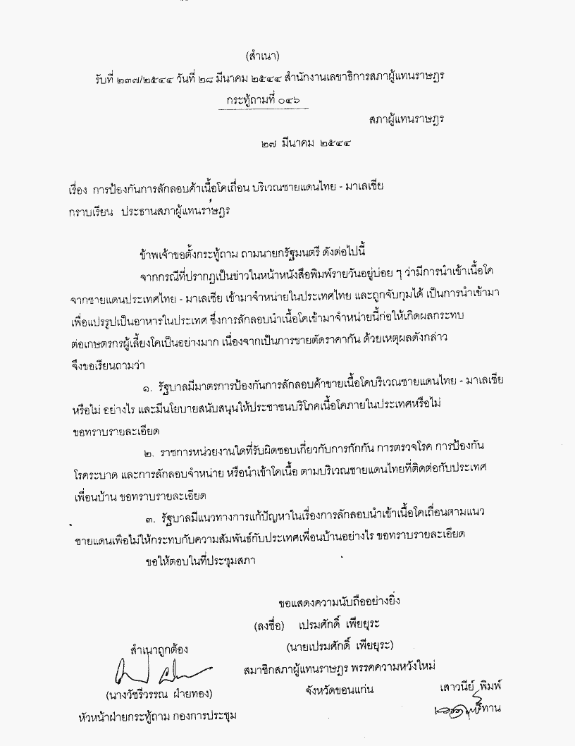 กระทู้ถาม ที่ 046 เรื่อง การป้องกันการลักลอบค้าเนื้อโคเถื่อนบริเวณชายแดนไทย - มาเลเซีย นายเปรมศักดิ์ เพียยุระ เป็นผู้ตั้งกระทู้ถาม ถามนายกรัฐมนตรี |