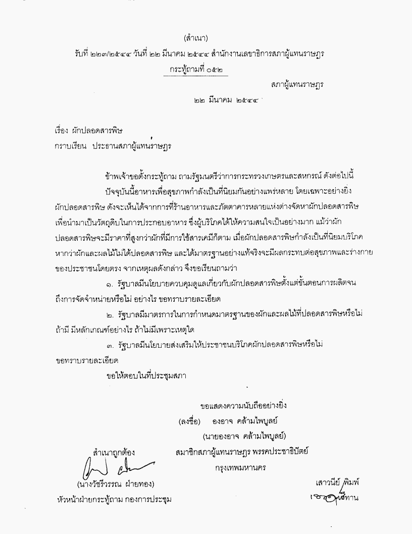 กระทู้ถาม ที่ 052 เรื่อง ผักปลอดสารพิษ นายองอาจ คล้ามไพบูลย์ เป็นผู้ตั้งกระทู้ถาม ถามรัฐมนตรีว่าการกระทรวงเกษตรและสหกรณ์ |