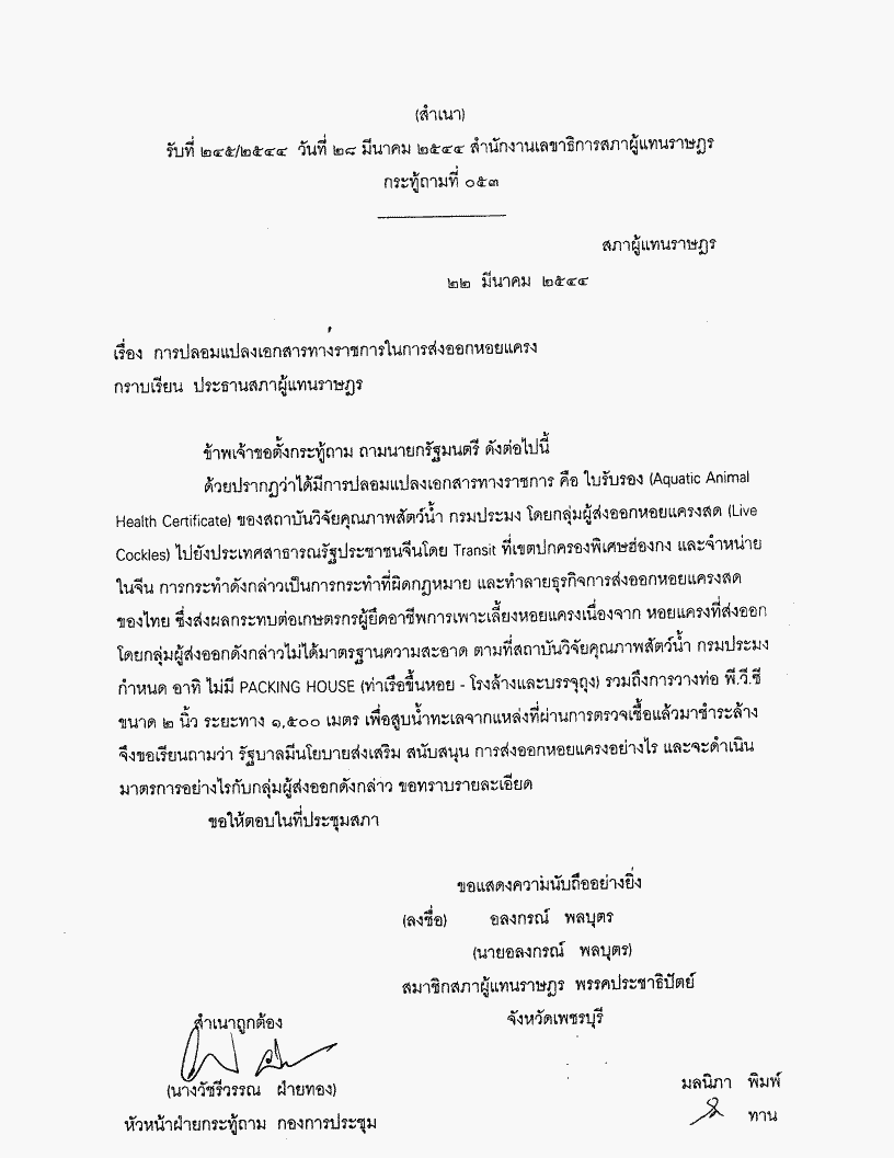 กระทู้ถาม ที่ 053 เรื่อง การปลอมแปลงเอกสารทางราชการในการส่งออกหอยแครง นายอลงกรณ์ พลบุตร เป็นผู้ตั้งกระทู้ถาม ถามนายกรัฐมนตรี |