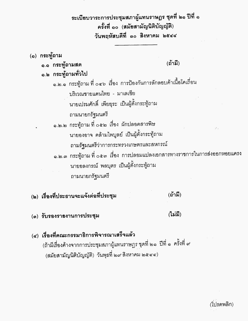 ระเบียบวาระการประชุมสภาผู้แทนราษฎร ชุดที่ 21 ปีที่ 1 ครั้งที่ 10 (สมัยสามัญนิติบัญญัติ) วันพฤหัสบดีที่ 30 สิงหาคม 2544 |