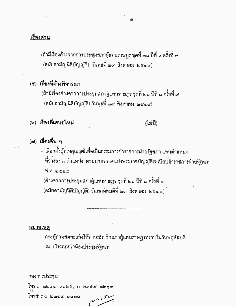 • ระเบียบวาระการประชุมสภาผู้แทนราษฎร ชุดที่ 21 ปีที่ 1 ครั้งที่ 10 (สมัยสามัญนิติบัญญัติ) วันพฤหัสบดีที่ 30 สิงหาคม 2544