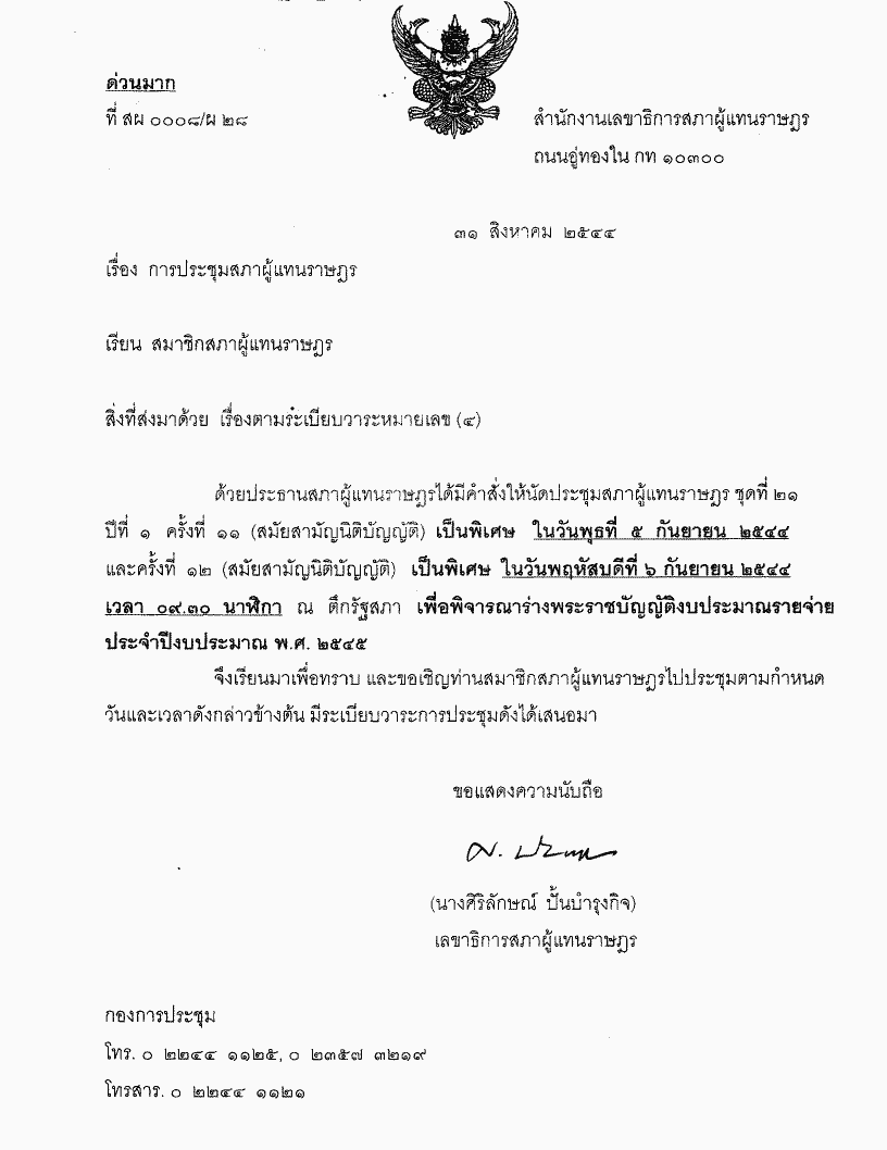 ระเบียบวาระการประชุมสภาผู้แทนราษฎร ซุดที่ 21 ปีที่ 1 ครั้งที่ 11 (สมัยสามัญนิติบัญญัติ)วันพุธที่ 5 กันยายน 2544 |