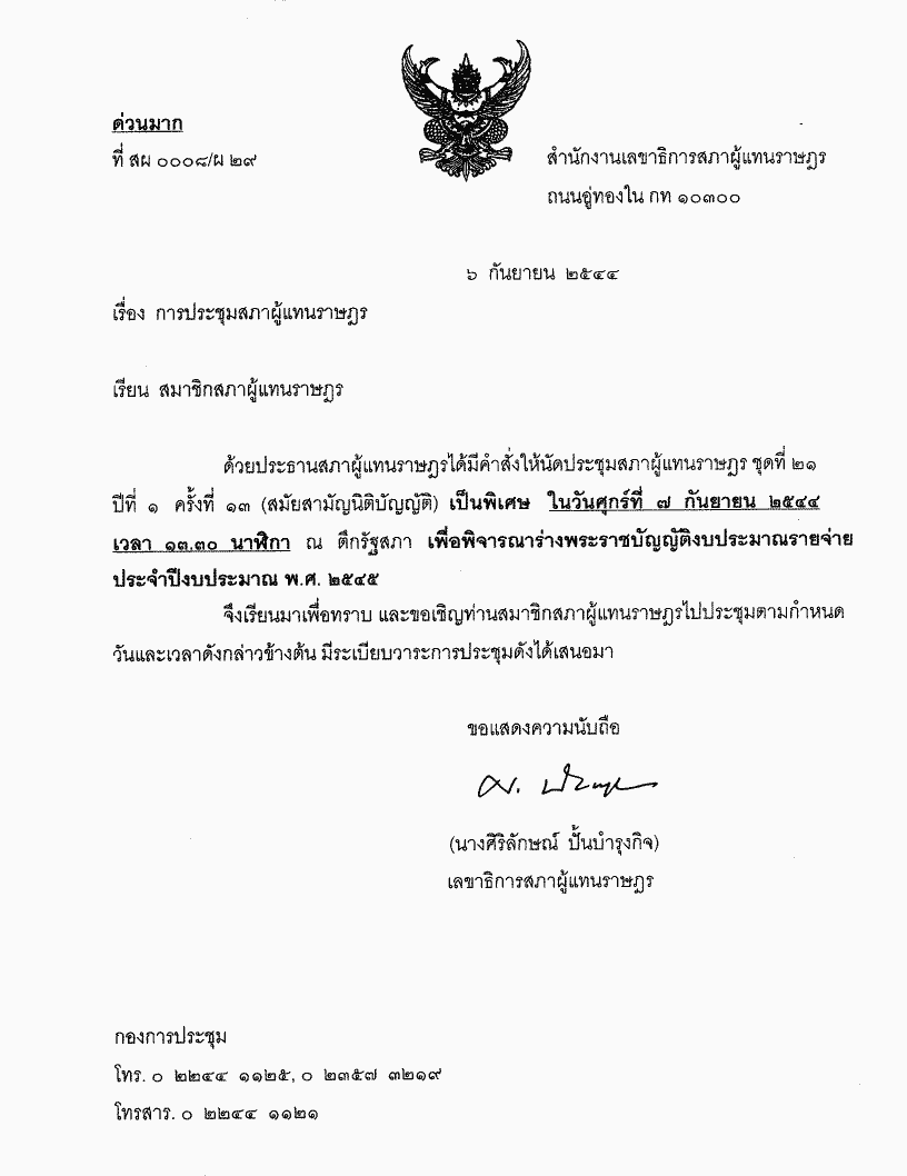 ชื่อเอกสาร : ระเบียบวาระการประชุมสภาผู้แทนราษฎร ชุดที่ 21 ปีที่ 1 ครั้งที่ 13 (สมัยสามัญนิติบัญญัติ) วันศุกร์ที่ 7 กันยายน 2544
