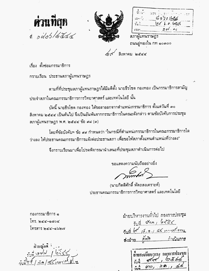ตั้งซ่อมกรรมาธิการสามัญประจำสภา ในคณะกรรมาธิการการวิทยาศาสตร์ และเทคโนโลยีแทนตำแหน่งที่ว่างลง 1 ตำแหน่ง เพราะลาออก (นายธีรโชต กองทอง) |