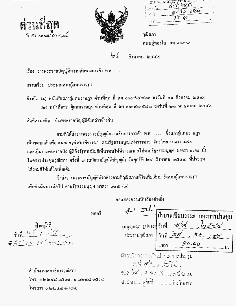 ชื่อเอกสาร :   พิจารณากรณีวุฒิสภาแก้ไขเพิ่มเติมร่างพระราชบัญญัติความลับทางการค้า พ.ศ.....ตามมาตรา 175 ของรัฐธรรมนูญแห่งราชอาณาจักรไทย