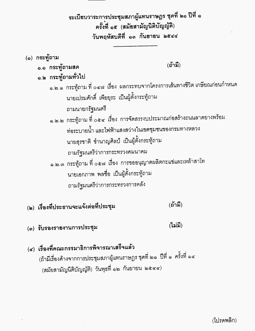 • ระเบียบวาระการประชุมสภาผู้แทนราษฎร ชุดที่ 21 ปีที่ 1 ครั้งที่ 15 (สมัยสามัญนิติบัญญัติ) วันพฤหัสบดีที่ 13 กันยายน 2544