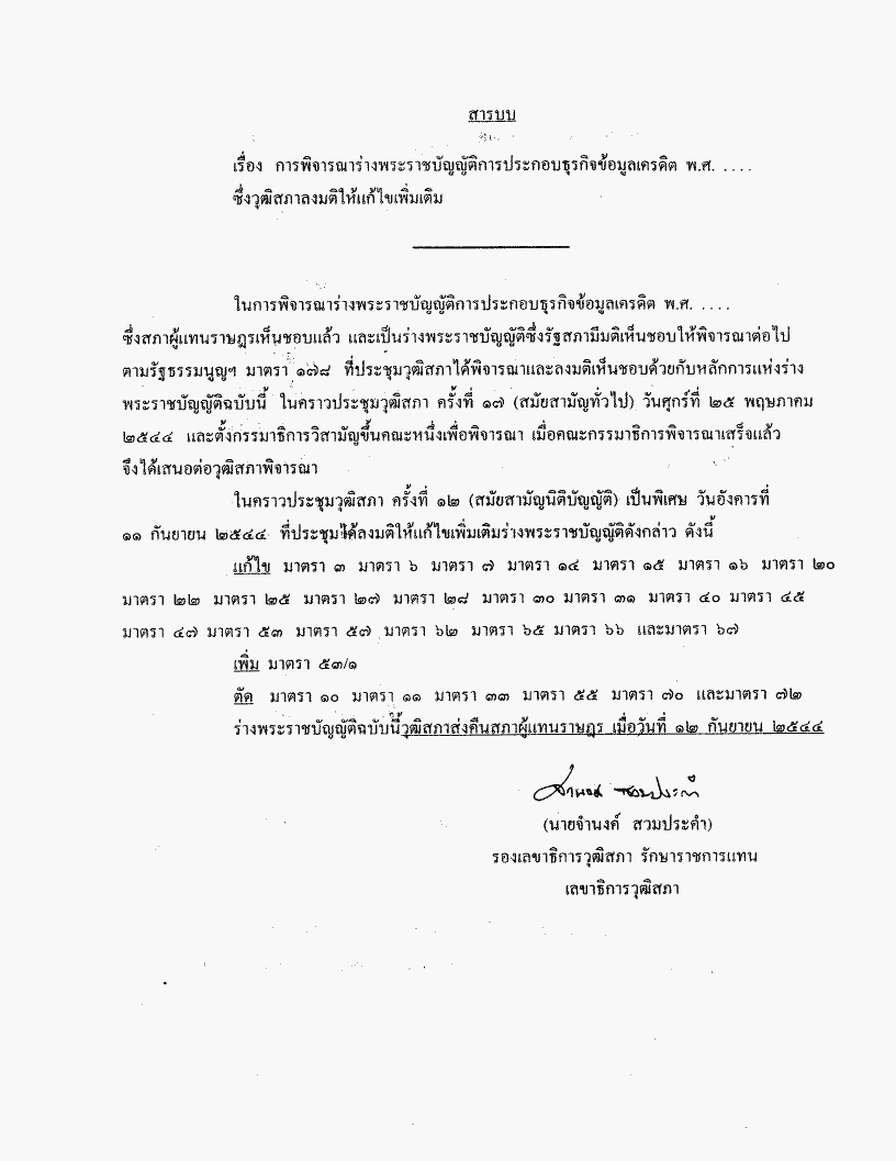• พิจารณากรณีวุฒิสภาแก้ไขเพิ่มเติมร่างพระราชบัญญัติการประกอบธุรกิจข้อมูลเครดิต พ.ศ.... ตามมาตรา 175 ของรัฐธรรมนูญแห่งราชอาณาจักรไทย