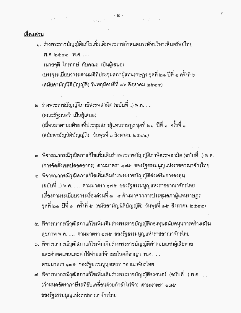 • ระเบียบวาระการประชุมสภาผู้แทนราษฎร ชุดที่ 21 ปีที่ 1 ครั้งที่ 16 (สมัยสามัญนิติบัญญัติ) วันพุธที่ 19 กันยายน 2544