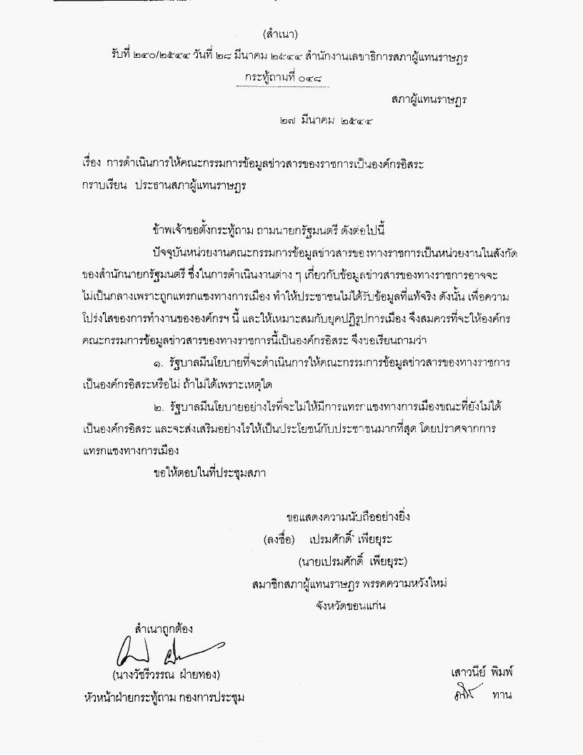 กระทู้ถาม ที่ 048 เรื่อง การดำเนินการให้คณะกรรมการข้อมูลข่าวสารของราชการเป็นองค์กรอิสระ นายเปรมศักดิ์ เพียยุระ เป็นผู้ตั้งกระทู้ถามถามนายกรัฐมนตรี |