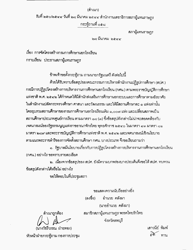 กระทู้ถาม ที่ 058 เรื่อง การจัดโครงสร้างกรมการศึกษานอกโรงเรียน นายอำนวย คลังผา เป็นผู้ตั้งกระทู้ถาม ถามนายกรัฐมนตรี |