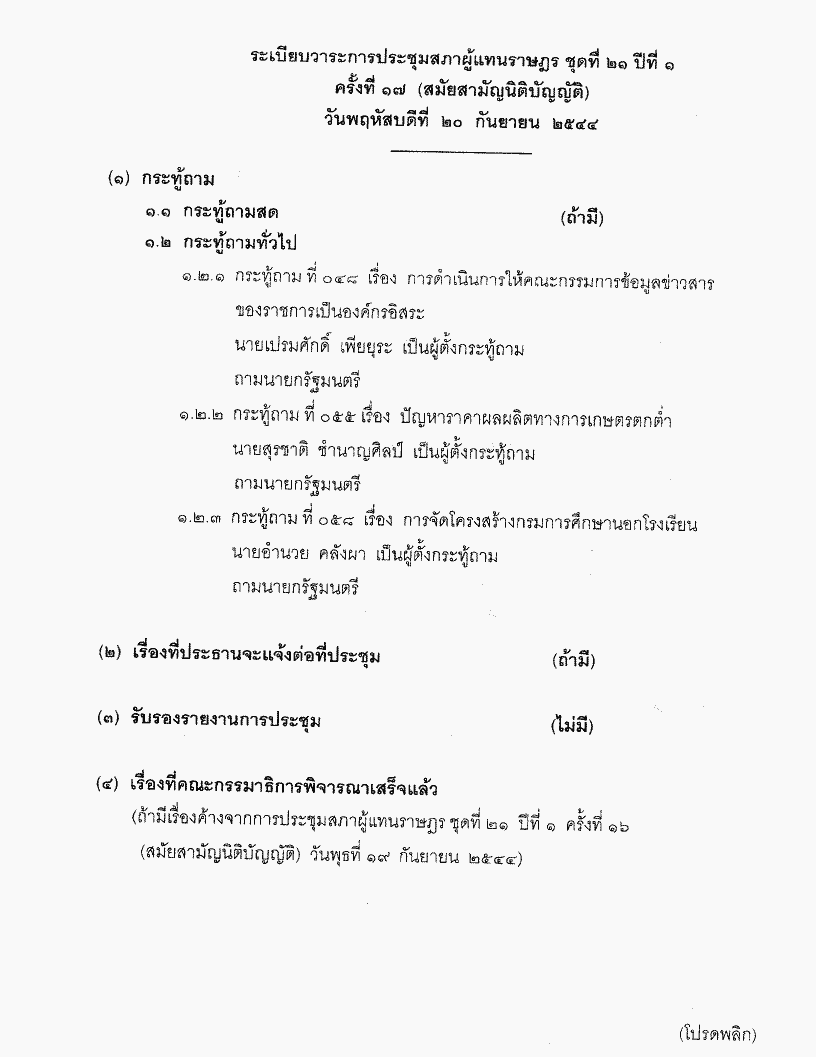 • ระเบียบวาระการประชุมสภาผู้แทนราษฎร ชุดที่ 21 ปีที่ 1 ครั้งที่ 17 (สมัยสามัญนิติบัญญัติ) วันพฤหัสบดีที่ 20 กันยายน 2544