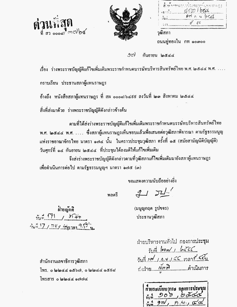• ร่างพระราชบัญญัติแก้ไขเพิ่มเติมพระราชกำหนดบรรษัทบริหารสินทรัพย์ไทย พ. ศ . 2544 พ. ศ..... (นายจุติ ไกรฤกษ์ กับคณะ เป็นผู้เสนอ)