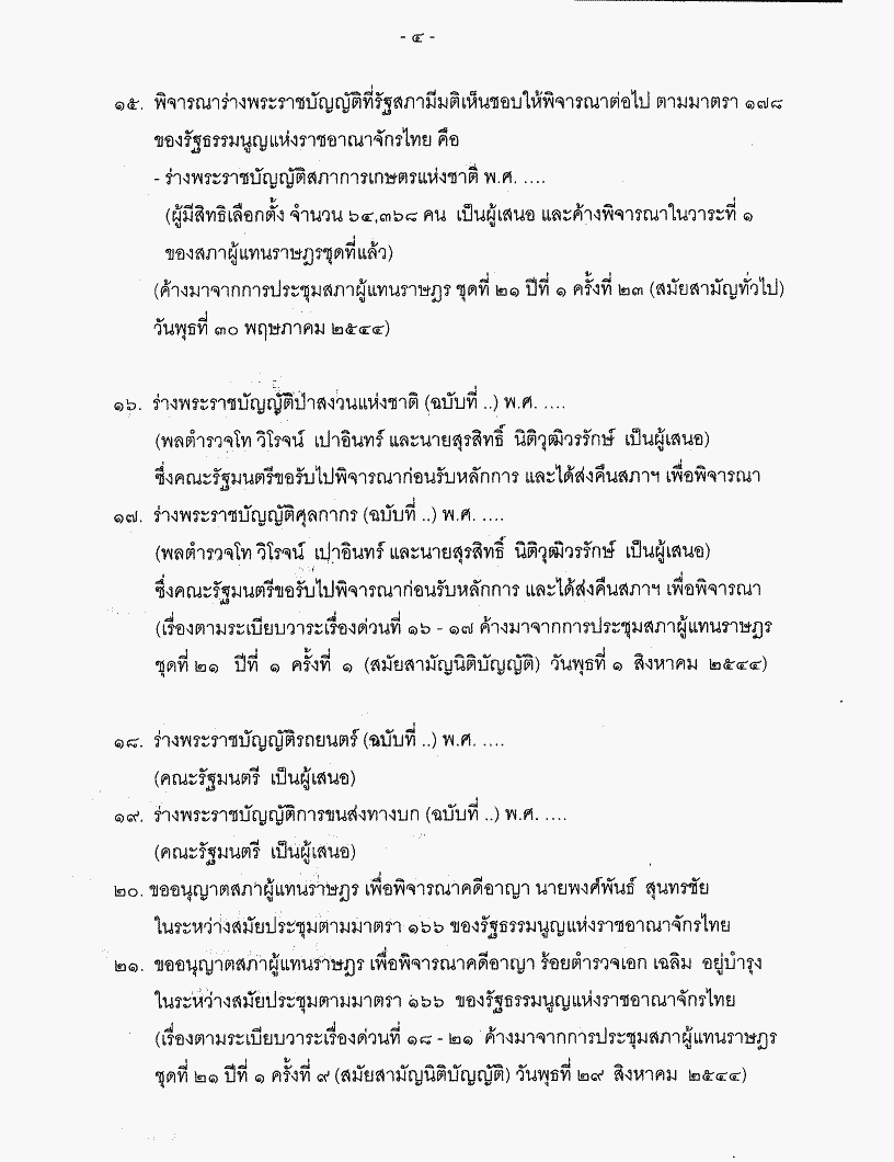 ระเบียบวาระการประชุมสภาผู้แทนราษฎร ชุดที่ 21 ปีที่ 1 ครั้งที่ 16 (สมัยสามัญนิติบัญญัติ) วันพุธที่ 19 กันยายน 2544 |